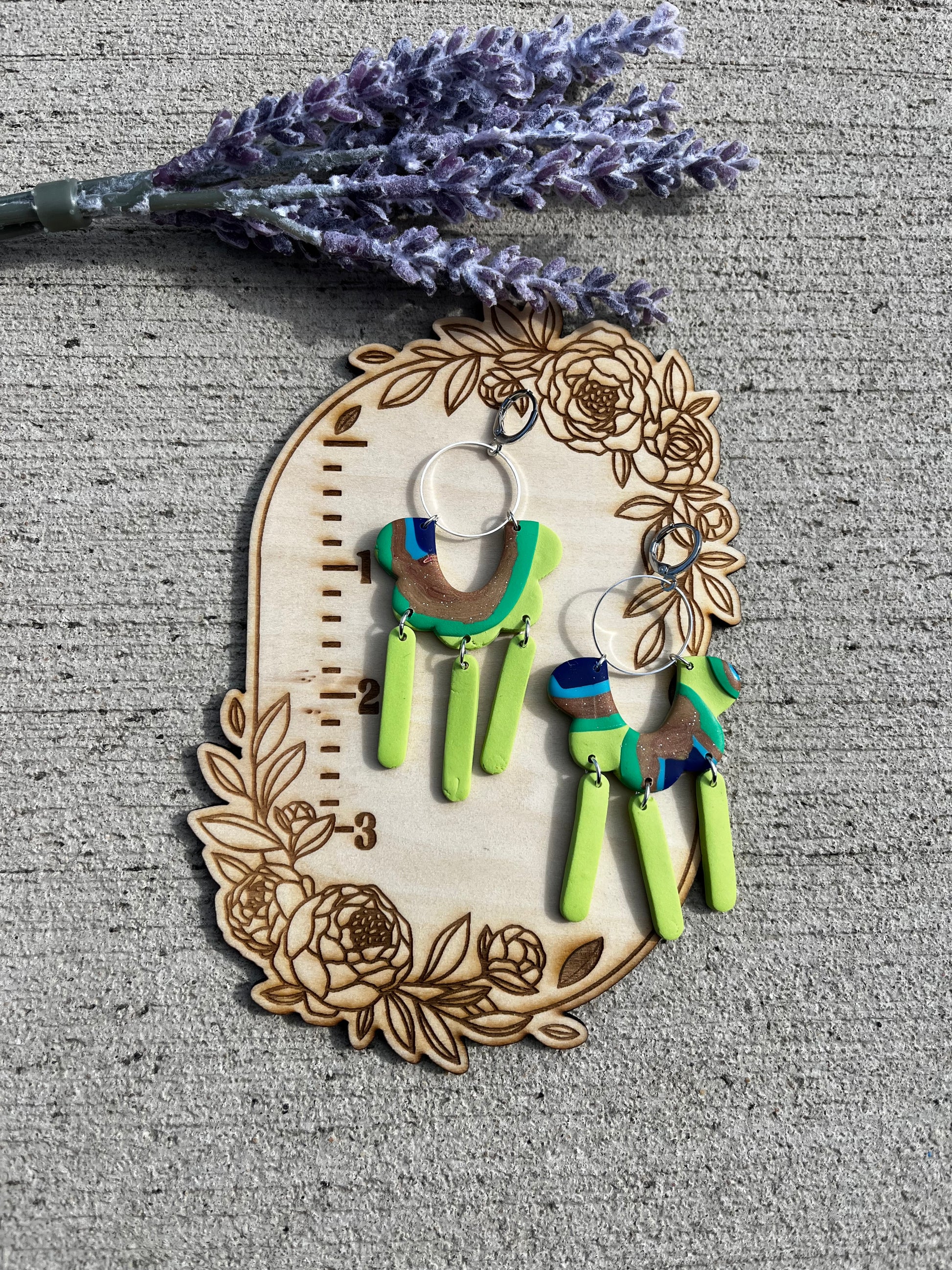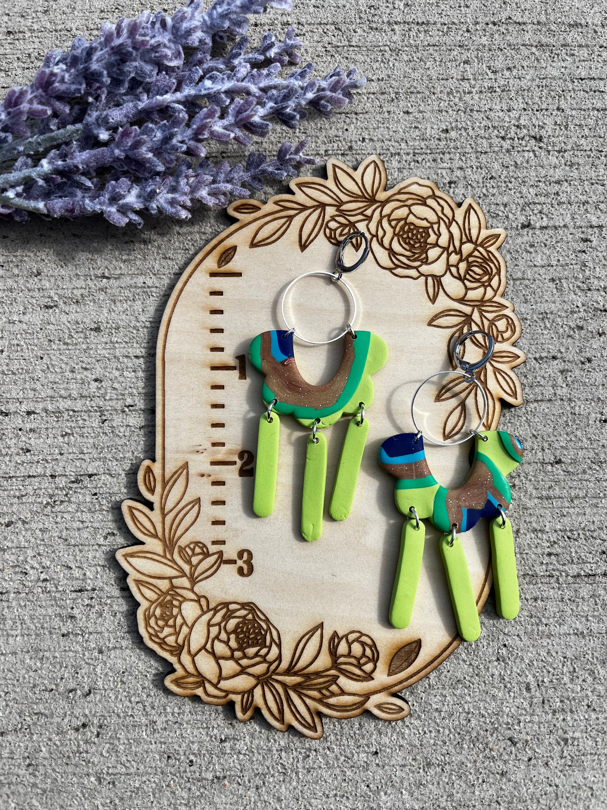 Hand made polymer clay earrings, made in central Pennsylvania. Perfect for causal, everyday wear that is simple, trendy, and distinct. They are lightweight, so much so that you might forget you are wearing them. They are made slowly and carefully by hand. Perfection is not my priority, but detail is. There may be minor flaws that add character and charm to our handmade pieces. Additionally, the piece you receive may not look identical to the one pictured as variations in the slab may create unique pieces.