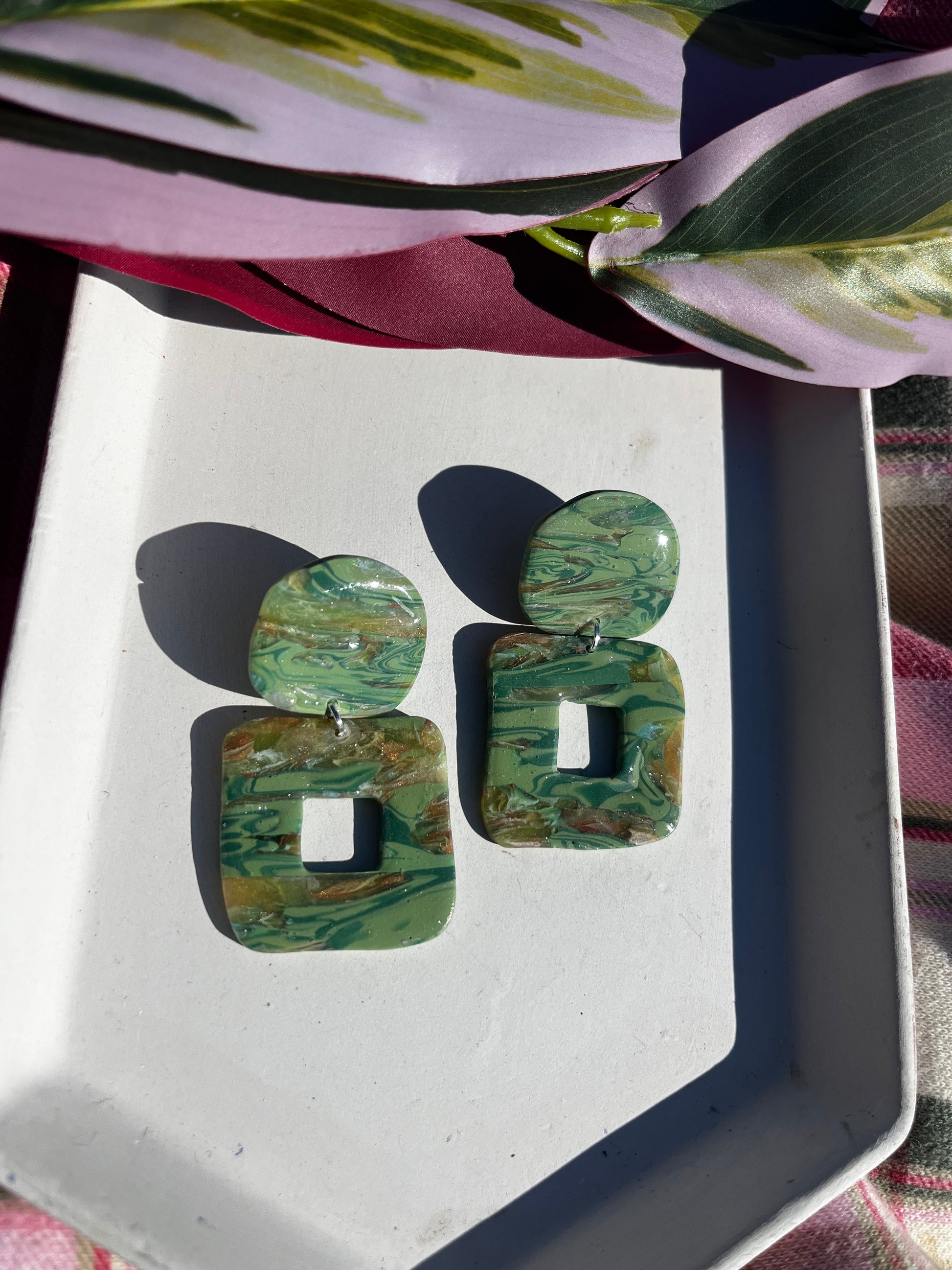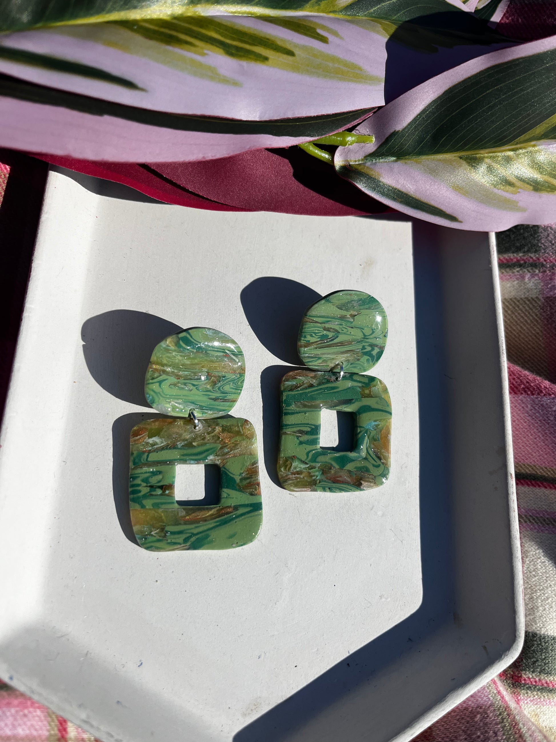 Artistically modern hand-made polymer clay earrings, made in central Pennsylvania. Perfect for causal, everyday wear that is simple, trendy, and distinct. They are lightweight, so much so that you might forget you are wearing them. They are made slowly and carefully by hand. Perfection is not my priority, but detail is. There may be minor flaws that add character and charm to our handmade pieces. Additionally, the piece you receive may not look identical to the one pictured as variations in the slab may create unique pieces.