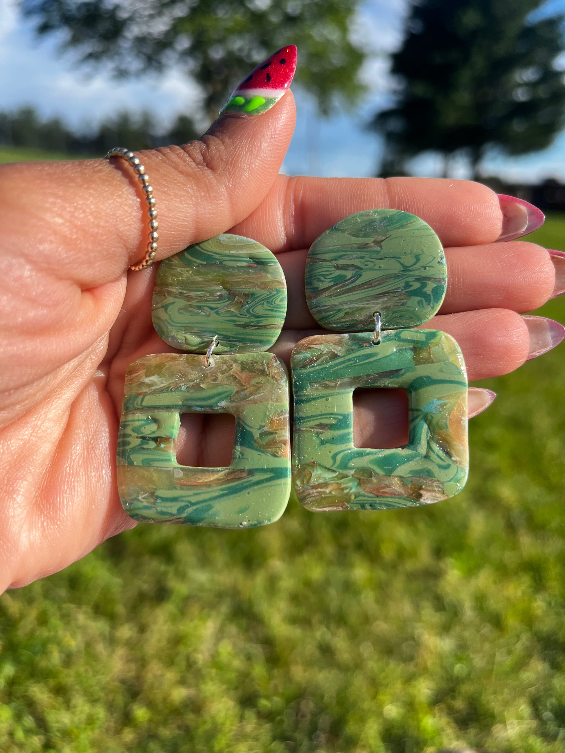 -Avoid swimming, showering, and sleeping in your earrings. Polymer clay is water-resistant but brass pieces and jump rings are not. Please note that brass can tarnish over time if exposed to water and oils from the skin but can be cleaned with a jewelry cloth or tarnish remover.